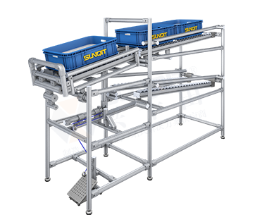 2.當(dāng)周轉(zhuǎn)箱被使用完,操作員腳踩踏板,旋轉(zhuǎn)臺(tái)下沉,空周轉(zhuǎn)箱自動(dòng)滑出。